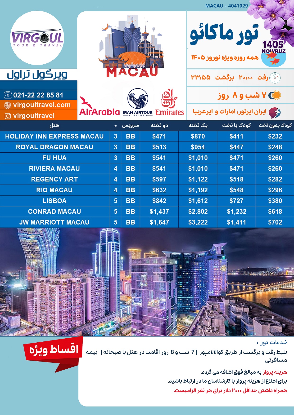 🔹 به دلیل اینکه ویرگول مجری مستقیم تور ماکائو در نوروز 1405 است، قیمتها کاملاً رقابتی ارائه میشوند.