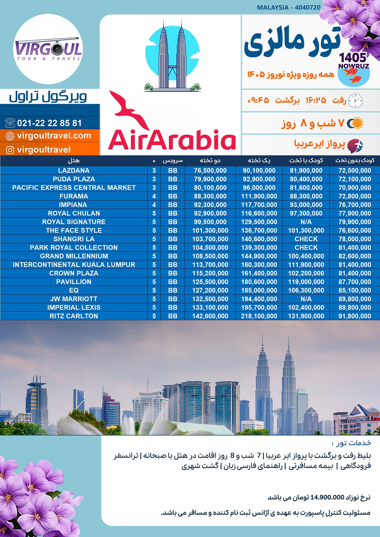 ویرگول تراول یکی از معتبرترین آژانسهای مسافرتی است که با ارائه تورهای متنوع به مالزی، انتخابی مناسب برای مسافران نوروزی است. خدمات این آژانس شامل: