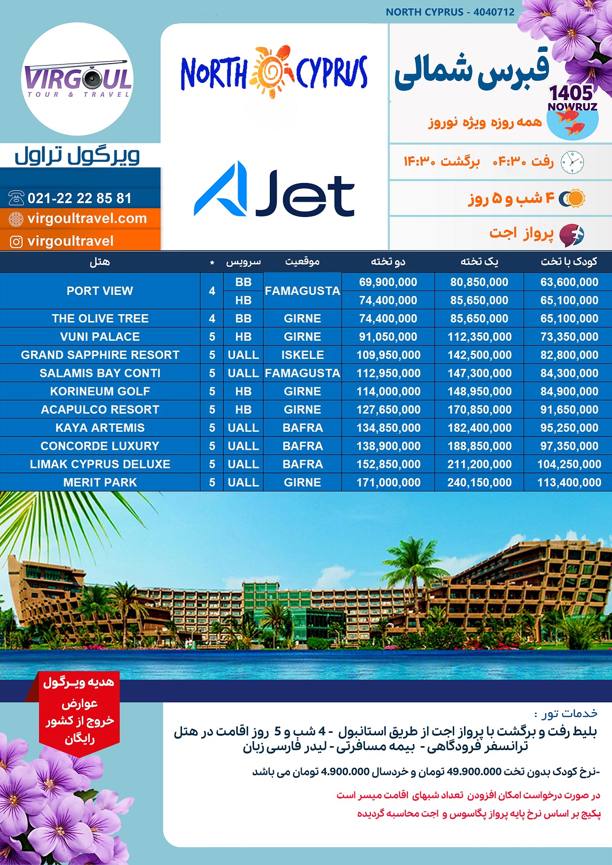 تور قبرس شمالی نوروز 1405 - رزرو تور قبرس شمالی نوروز 1405 - قیمت تور قبرس شمالی نوروز 1405 - تنها مجری مستقیم تور قبرس شمالی
