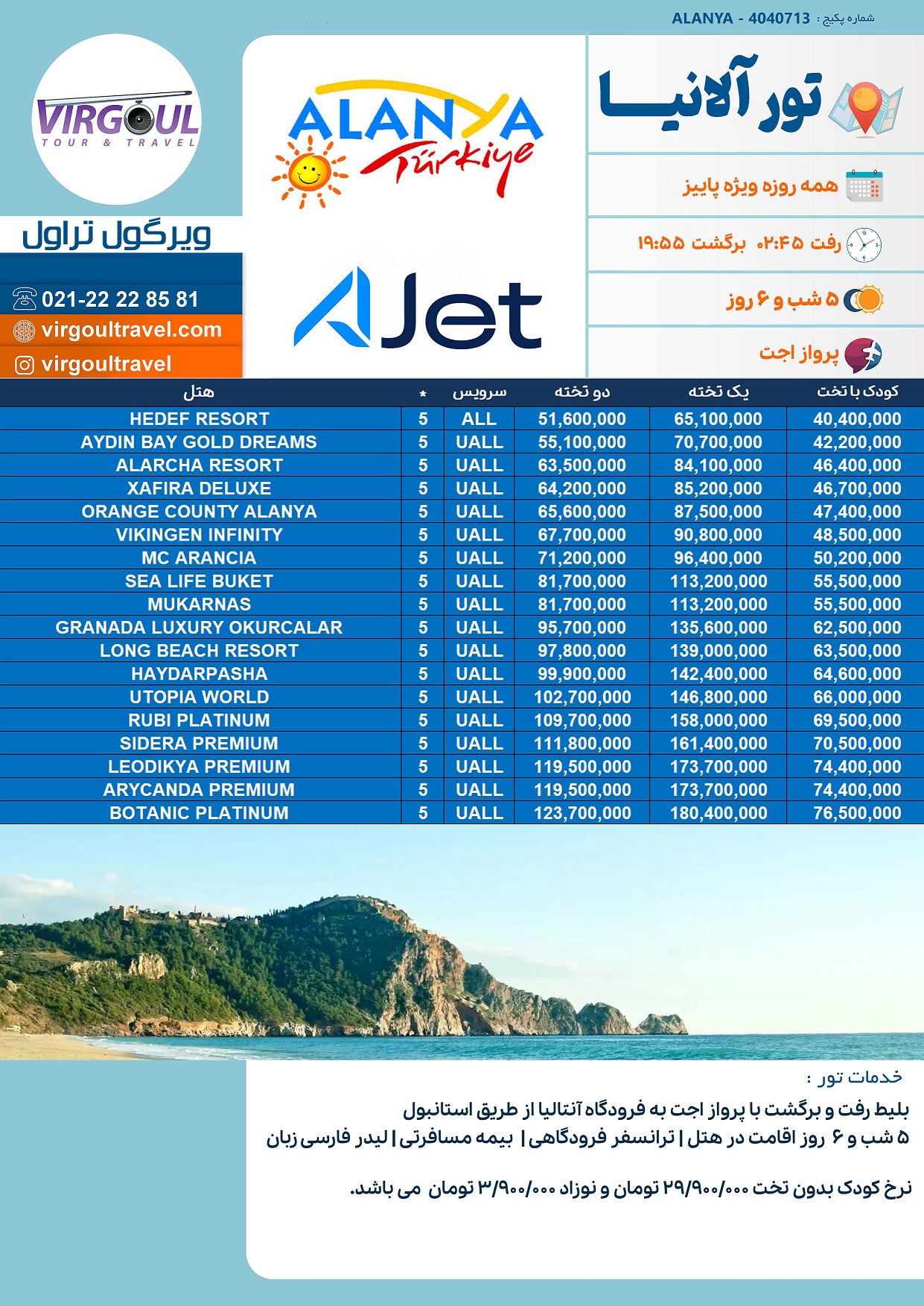 پرواز رفت و برگشت اجت از طریق استانبول به فرودگاه آنتالیا - 5 شب و 6 روز اقامت در هتل - ترانسفر رفت و برگشت فرودگاهی - بیمه مسافرتی - لیدر فارسی زبان