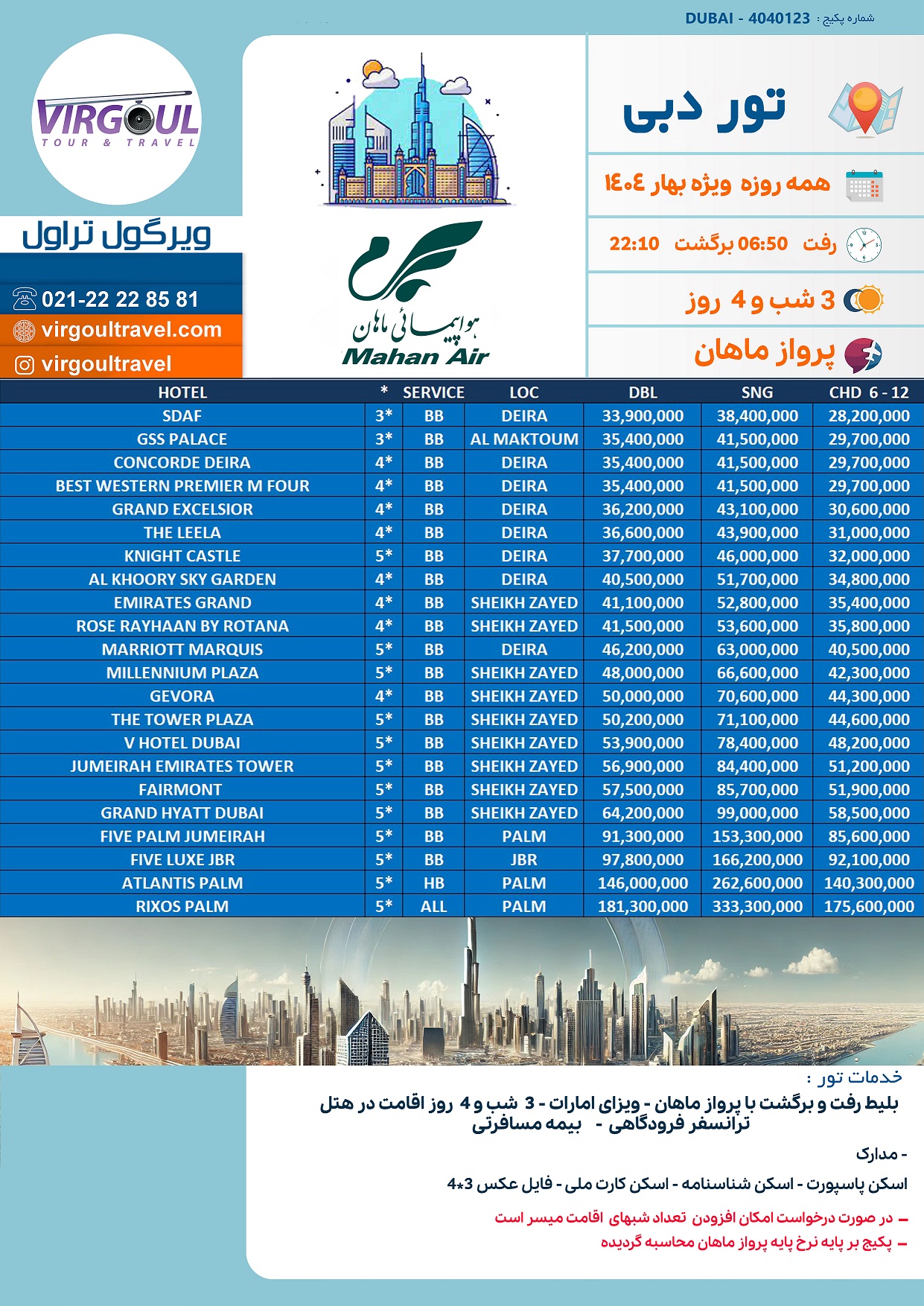 برای اطلاع از قیمت سایر هتلهای دبی و تاریخ های دیگر با کارشناسان ما تماس بگیرید. 02122228581