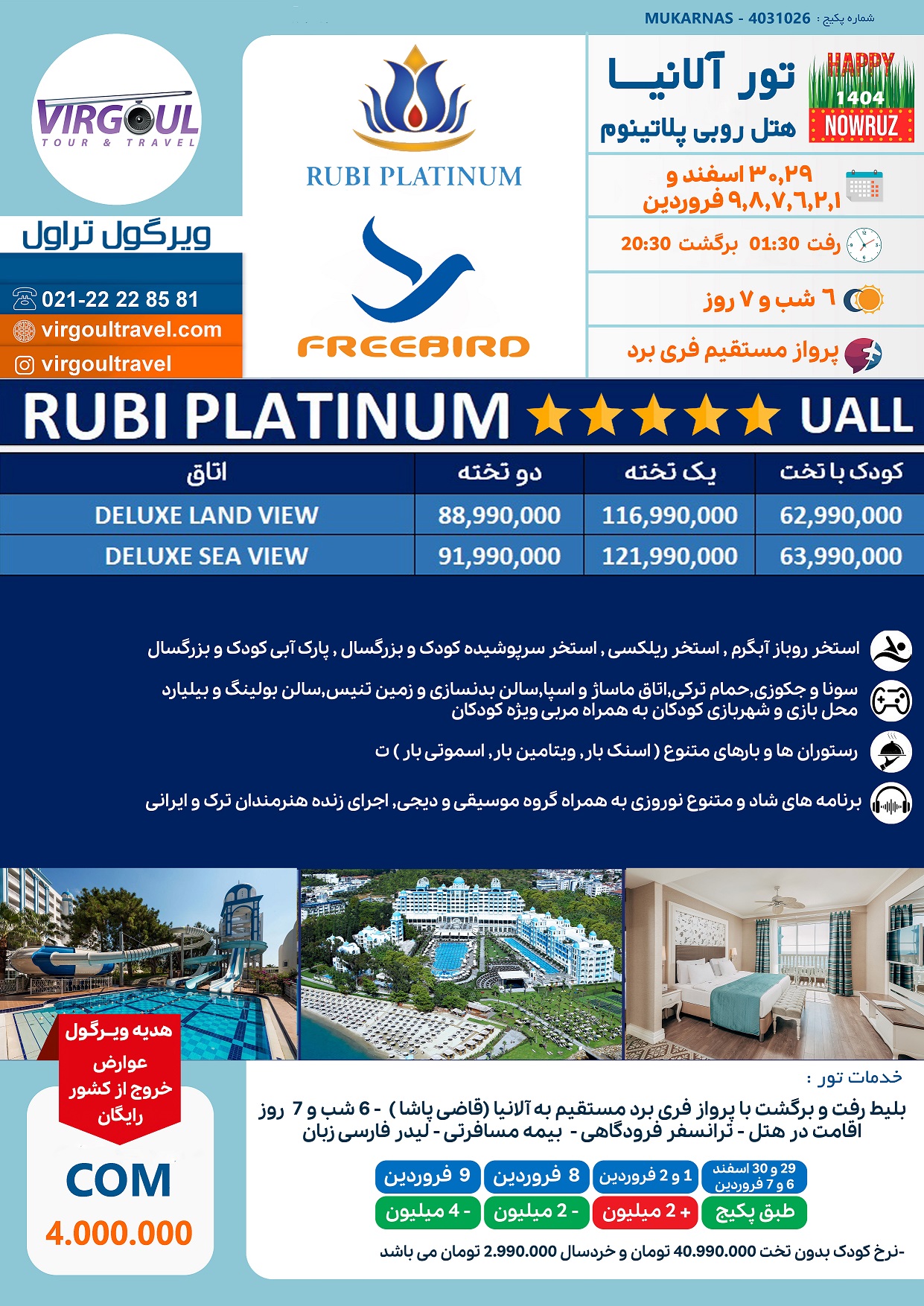 ۶ شب و ۷ روز اقامت در هتل ۵ ستاره روبی پلاتینوم با خدمات یوآل - پرواز مستقیم به آلانیا - ترانسفر فرودگاهی - لیدر فارسی زبان - بیمه مسافرتی