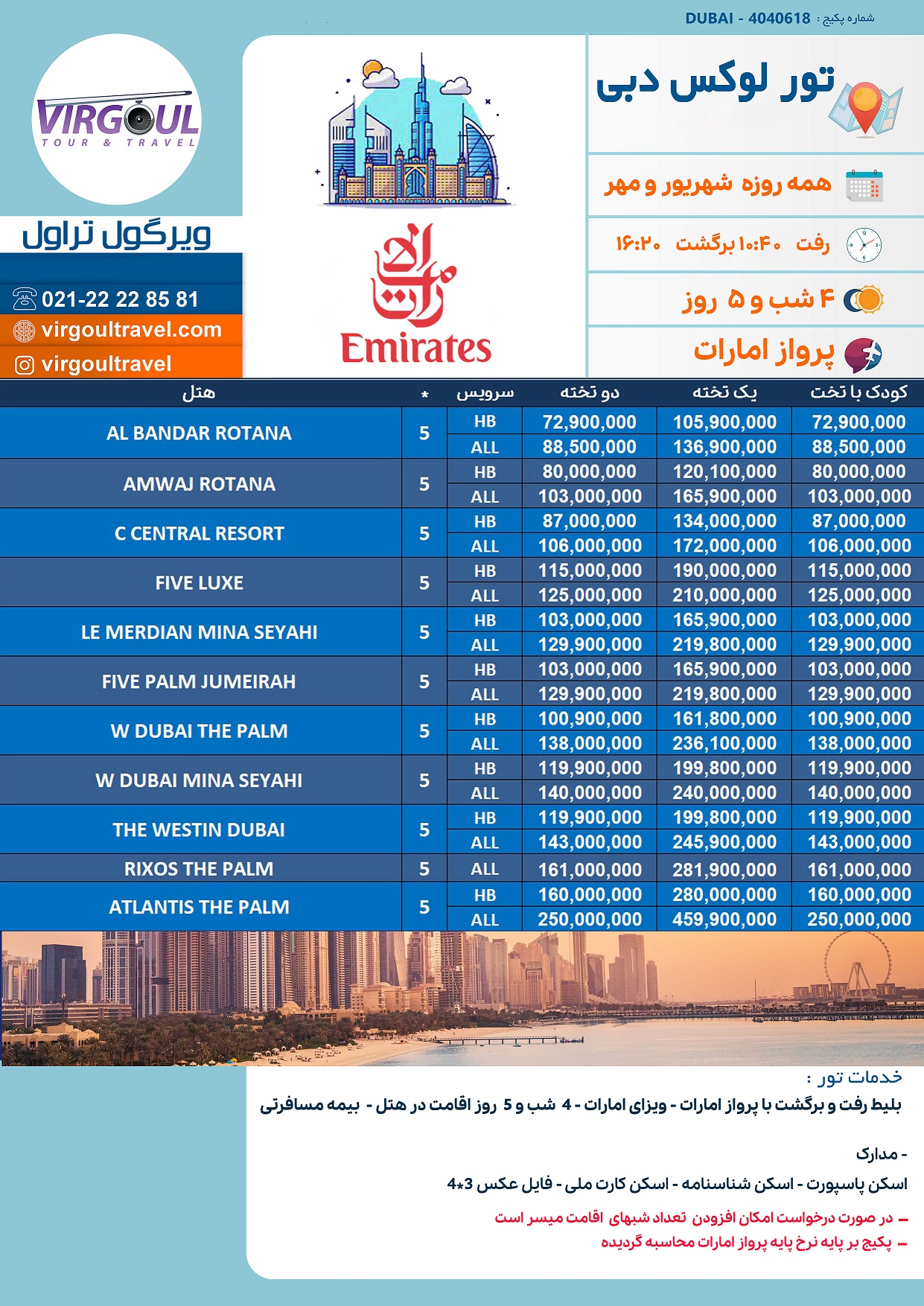بلیط رفت و برگشت با پرواز امارات – ویزا توریستی - 4 شب اقامت در هتل طبق خدمات پکیج – بیمه مسافرتی با پوشش کرونا