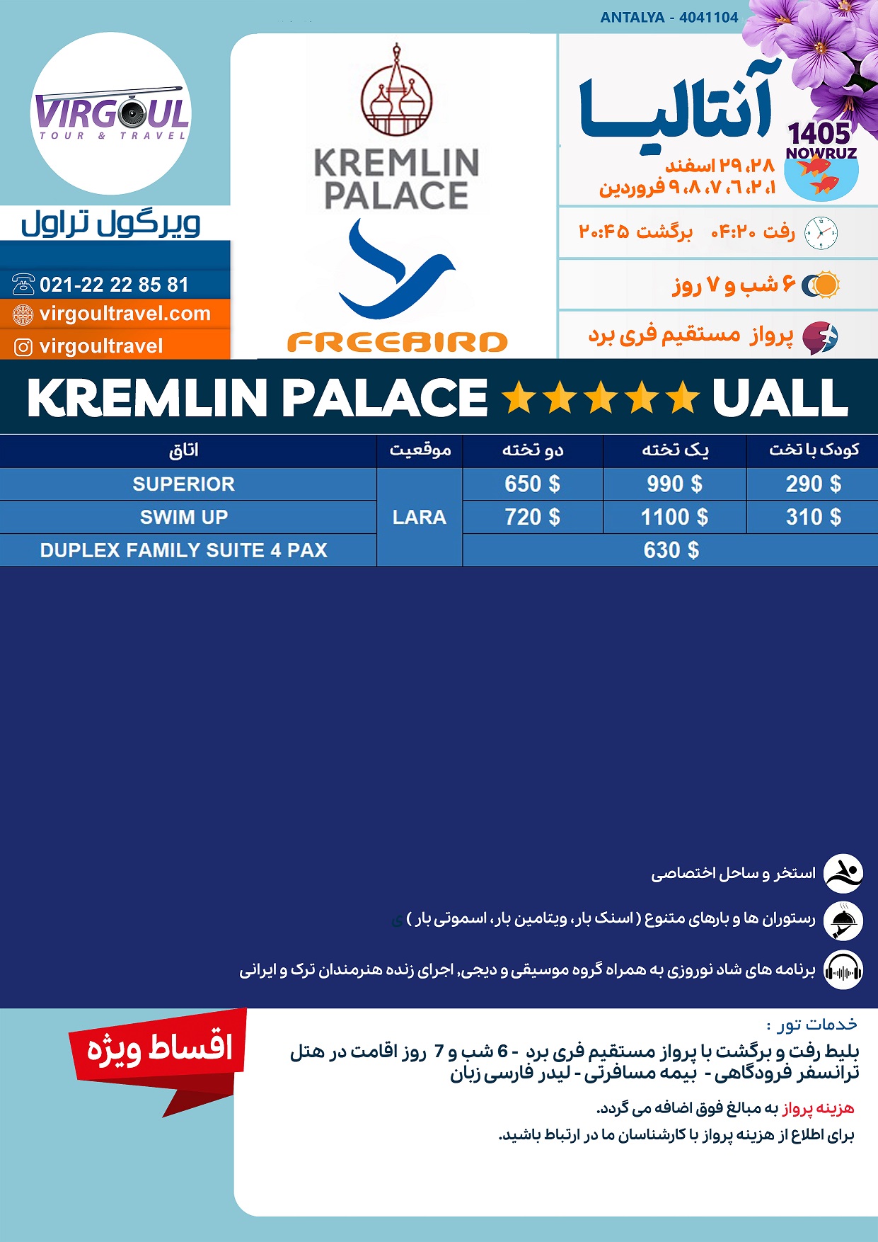 پرواز مستقیم ترک فری برد | اقامت در هتل با خدمات | ترانسفر فرودگاهی | بیمه مسافرتی | لیدر فارسی زبان