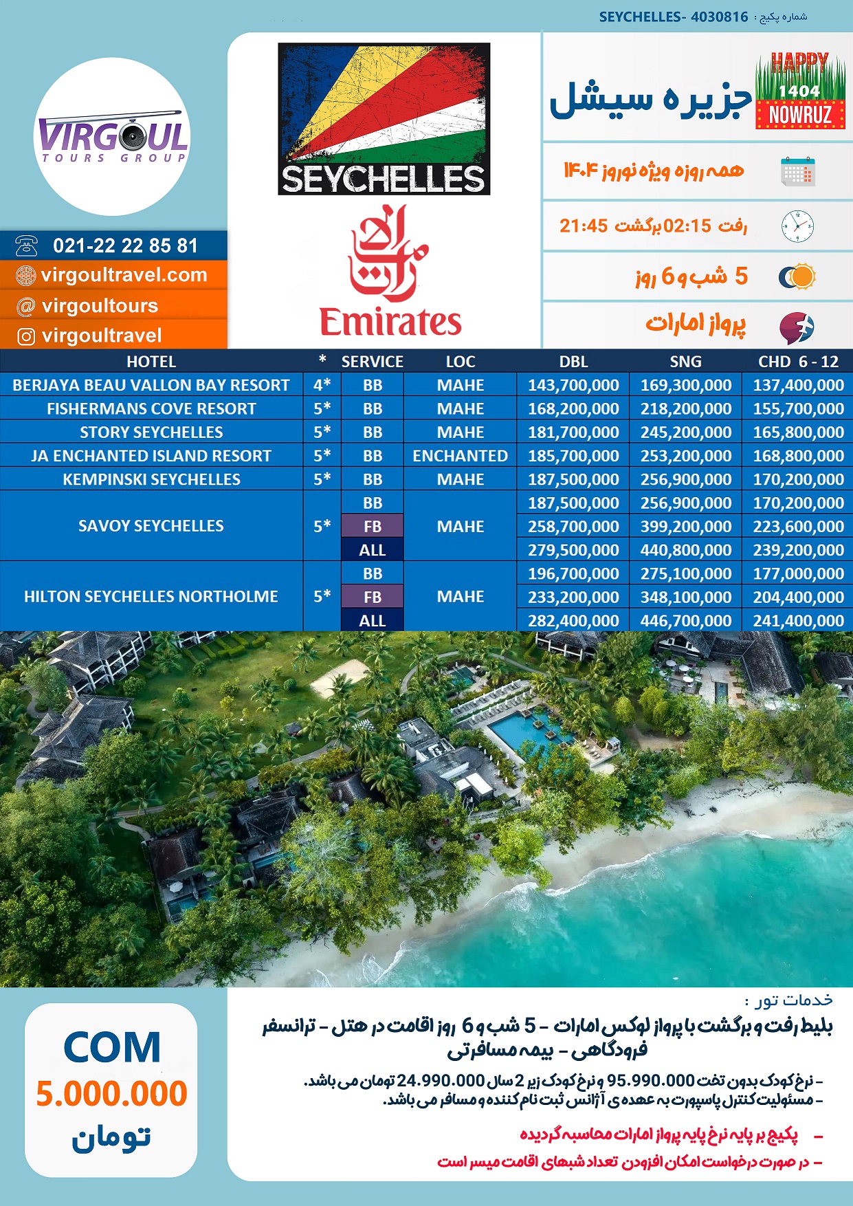 کارگزار سیشل - قیمت تور سیشل نوروز 1405 - هتل لوکس در سیشل