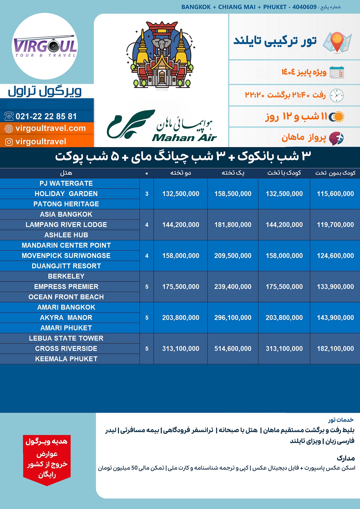 بلیط رفت و برگشت مستقیم ماهان | هتل با صبحانه | ترانسفر فرودگاهی | بیمه مسافرتی | لیدر فارسی زبان | ویزای تایلند