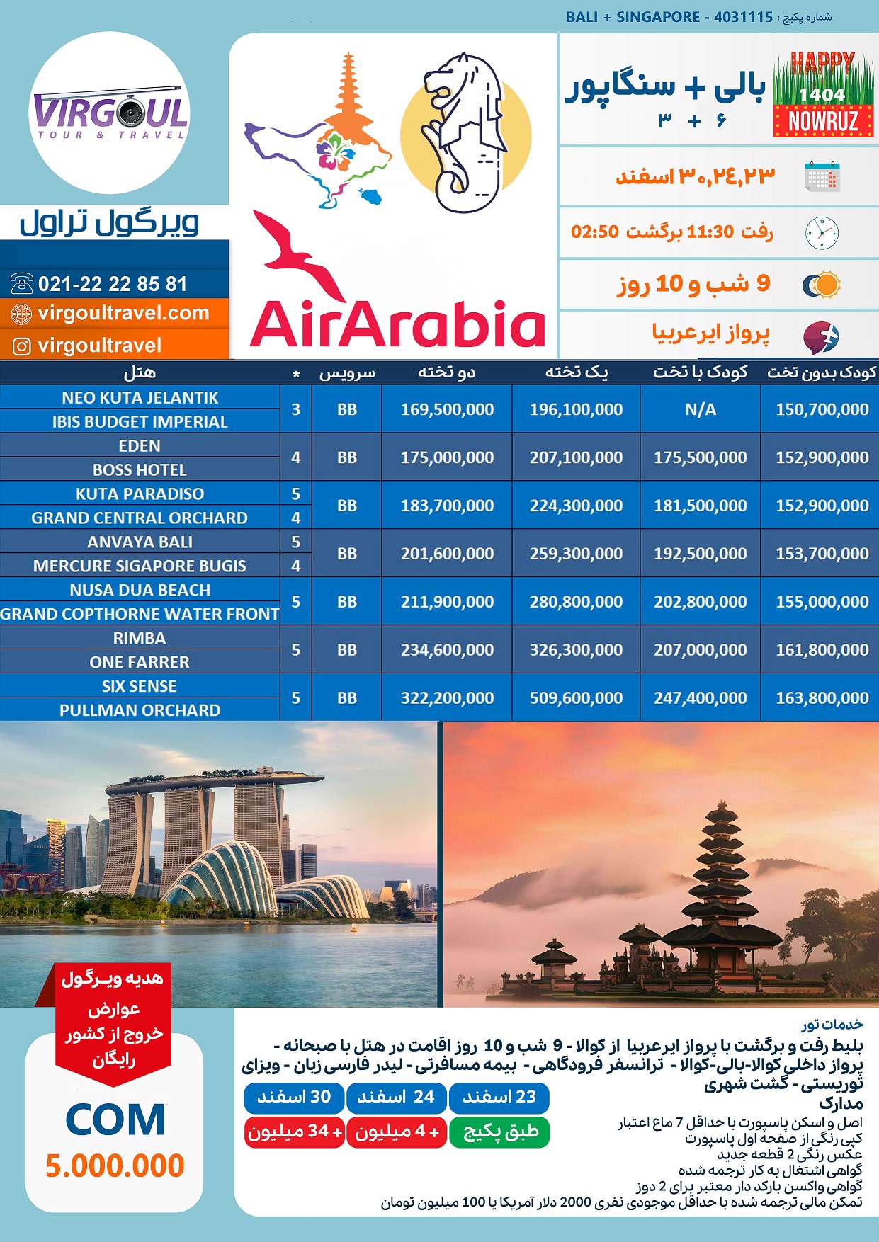 قیمت تور بالی سنگاپور پرواز ایر عربیا