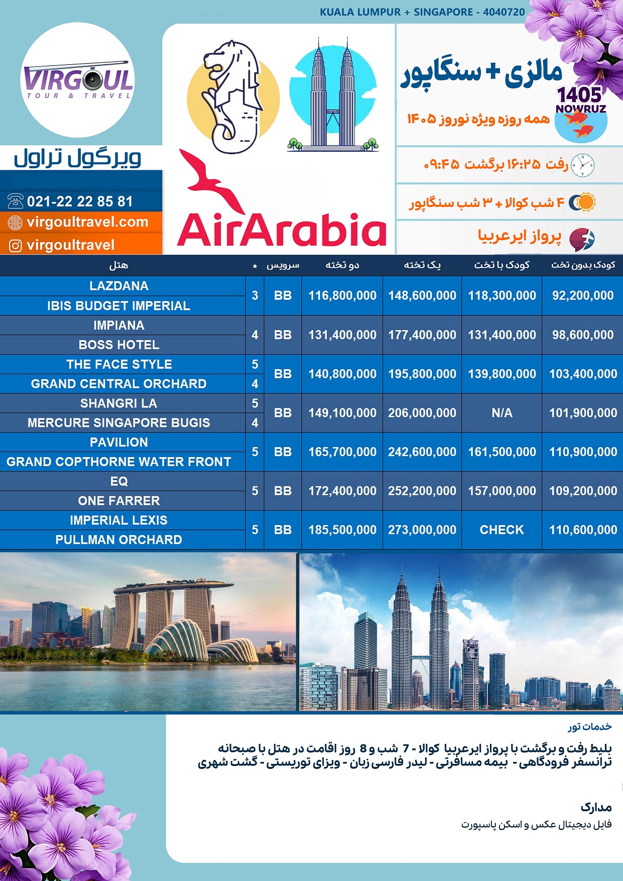 قیمت تور مالزی سنگاپور پرواز ایر عربیا