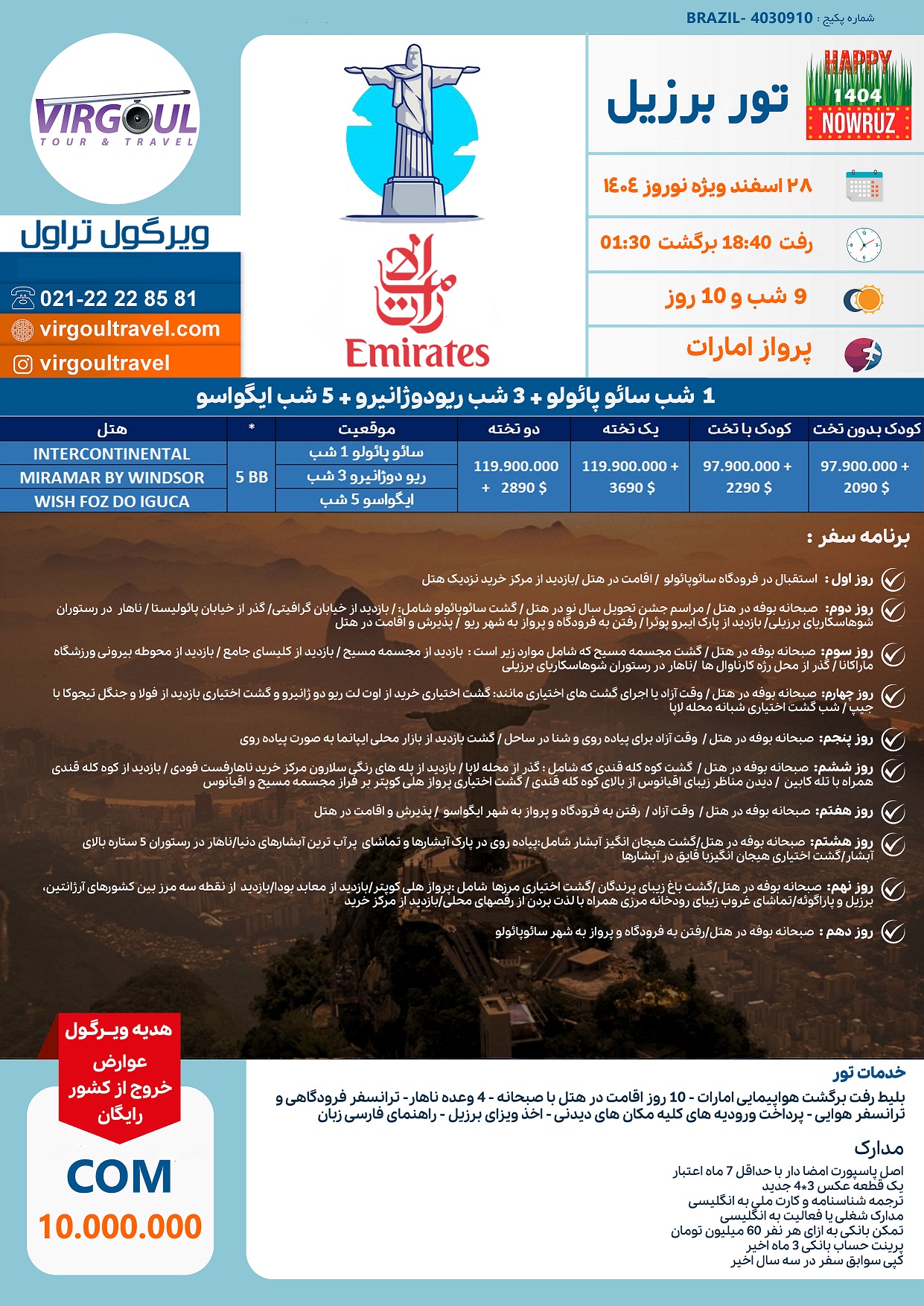 تور برزیل نوروز 1405 | قیمت تور برزیل نوروز 1405 | مجری مستقیم تور برزیل نوروز 1405 | تور ترکیبی برزیل نوروز 1405