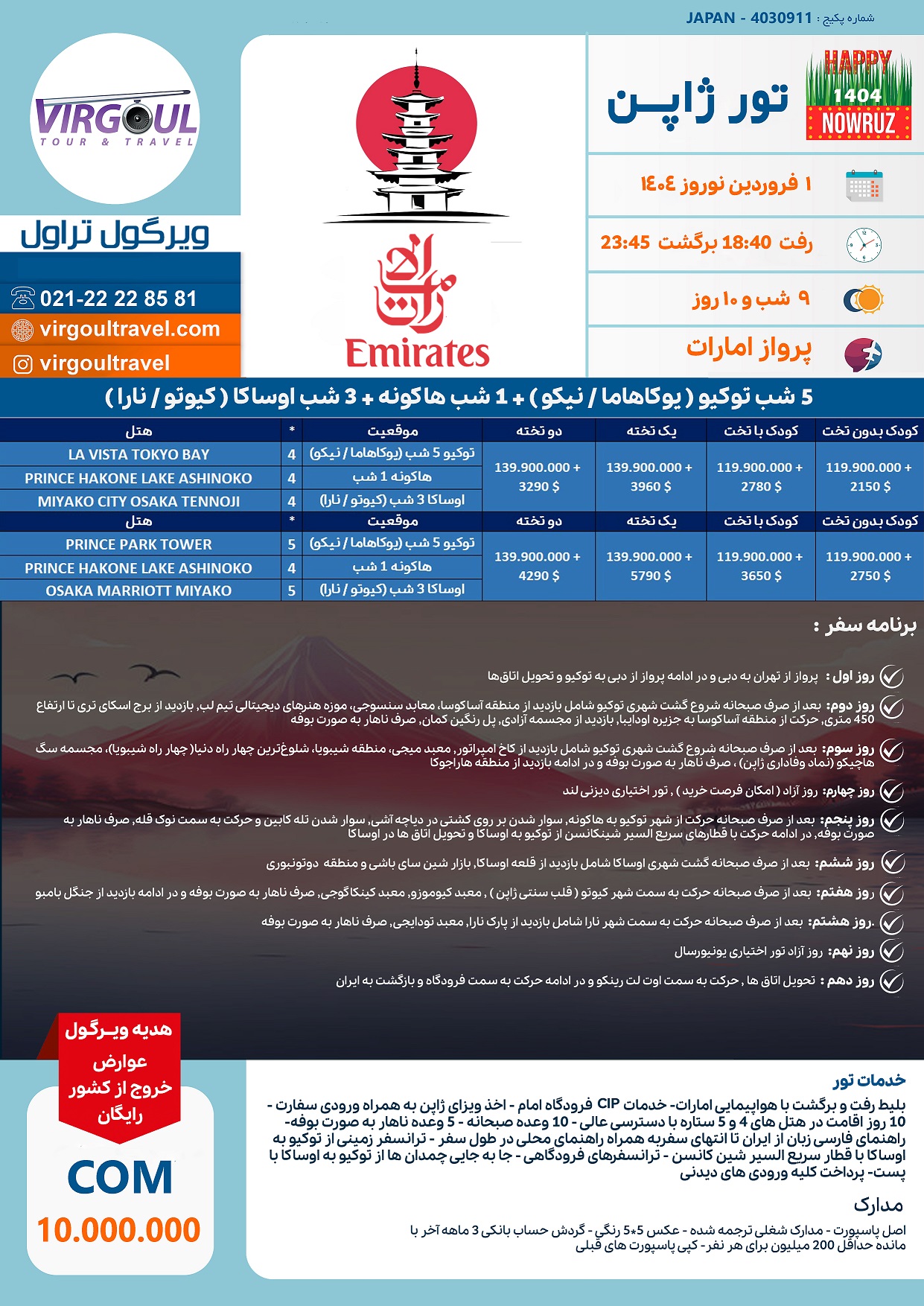 تور ژاپن نوروز 1405 | بازدید از 7 شهر توکیو, یوکاهاما, نیکو, هاکونه, اوساکا, نارا و کیوتو| قیمت تور ژاپن نوروز 1405 | عوارض خروج رایگان
