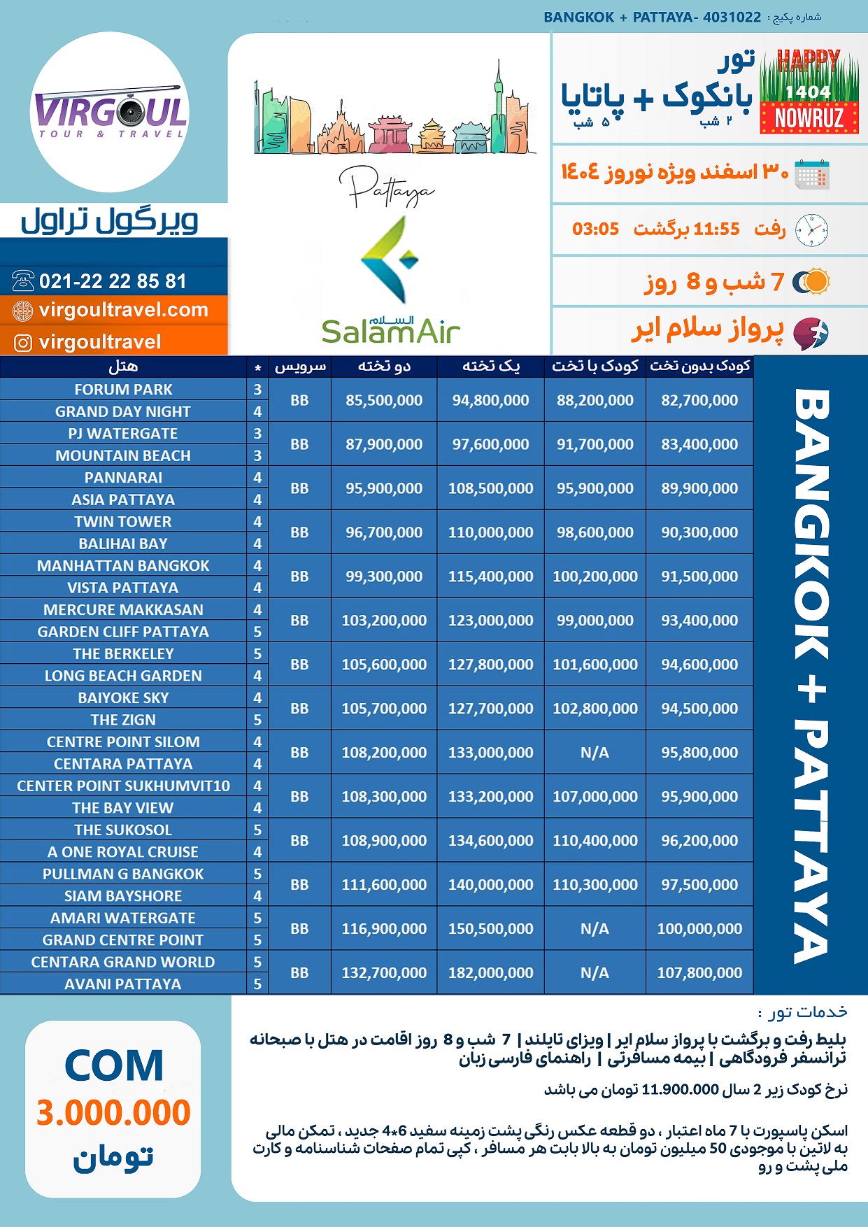 تور بانکوک پاتایا نوروز 1405 - قیمت تور بانکوک پاتایا نوروز 1405 - تور لحظه آخری بانکوک پاتایا نوروز 1405