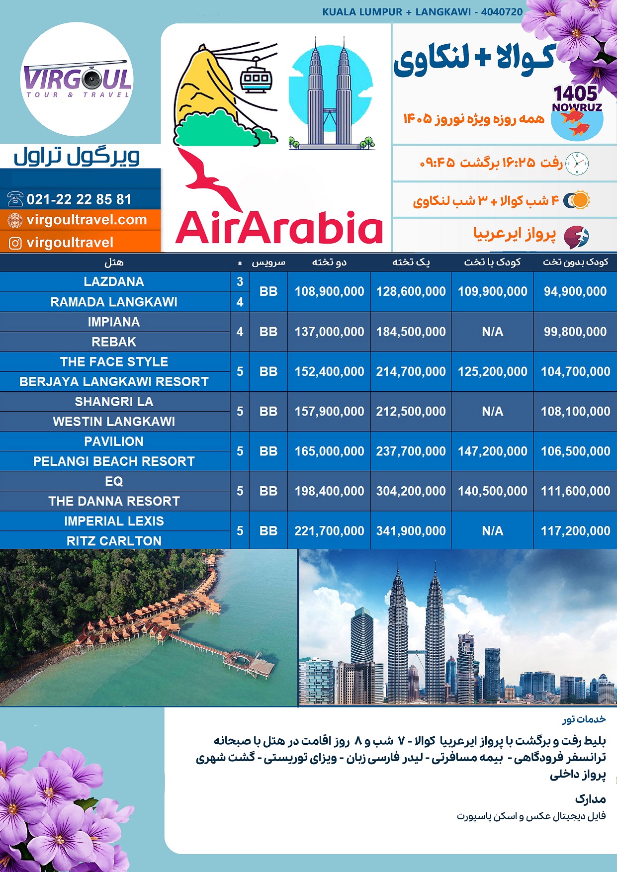 تور کوالا لنکاوی نوروز 1405 | قیمت تور کوالا لنکاوی نوروز 1405 | تور ترکیبی مالزی کوالا لنکاوی | عوارض خرج از کشور رایگان