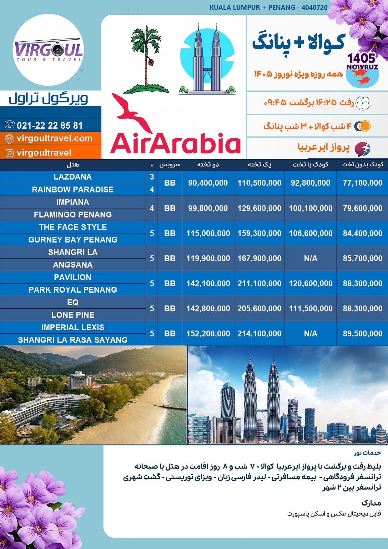 قیمت تور کوالا پنانگ پرواز ایر عربیا