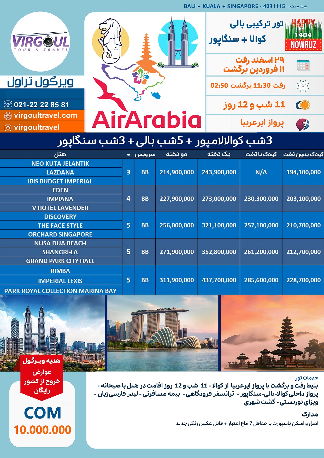 قیمت تور کوالا بالی سنگاپور نوروز 1405