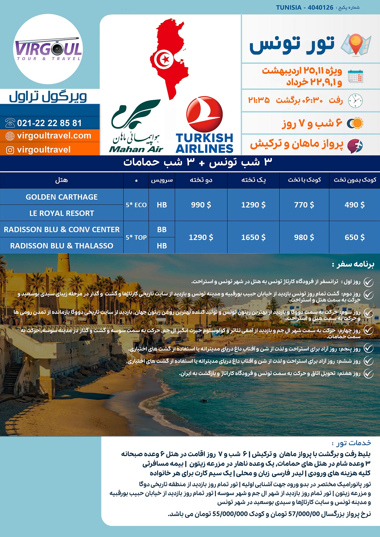 ویرگول مجری مستقیم تور تونس با بیش از یک دهه سابقه در برگزاری تورهای شمال آفریقا، بهترین قیمت و خدمات را ارائه میدهد: